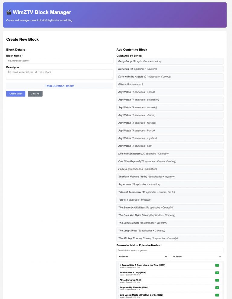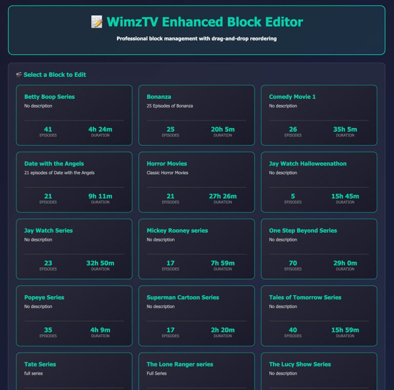 WimZTV introduces an innovative “block-based” approach to content scheduling. Instead of manually scheduling individual episodes, operators can create themed content blocks (like “Comedy Movie 1” with 26 episodes totaling 35h 5m) and schedule these blocks as units. This dramatically simplifies programming while maintaining precise control.
