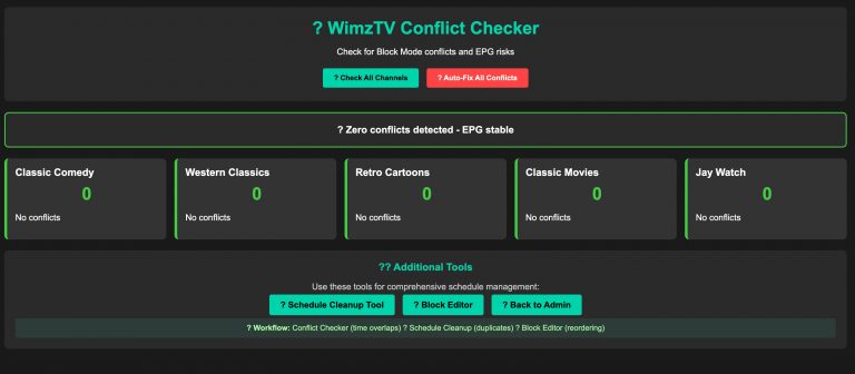 Ready to experience broadcast-quality streaming? WimZTV’s soft launch is now live, featuring seven channels of classic entertainment with precision scheduling and professional-grade delivery.