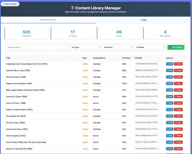 The platform manages over 525 content items (with 500 more on the way) across TV series and movies, with sophisticated categorization and metadata handling. Our Content Library Manager provides broadcast-quality organization with advanced filtering, bulk operations, and seamless content ingestion workflows.