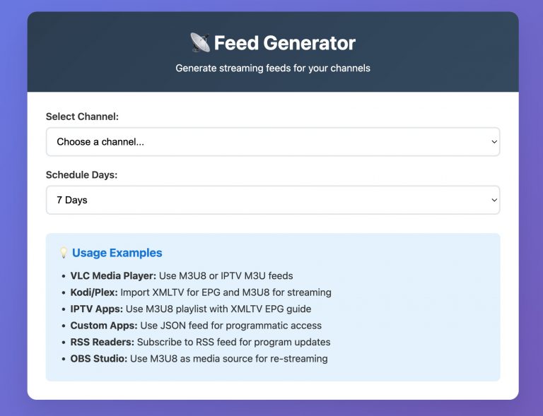 Feed Generator: Generates M3U8 playlists and XMLTV EPG guides compatible with VLC, Kodi/Plex, IPTV applications, and OBS Studio for re-streaming.
