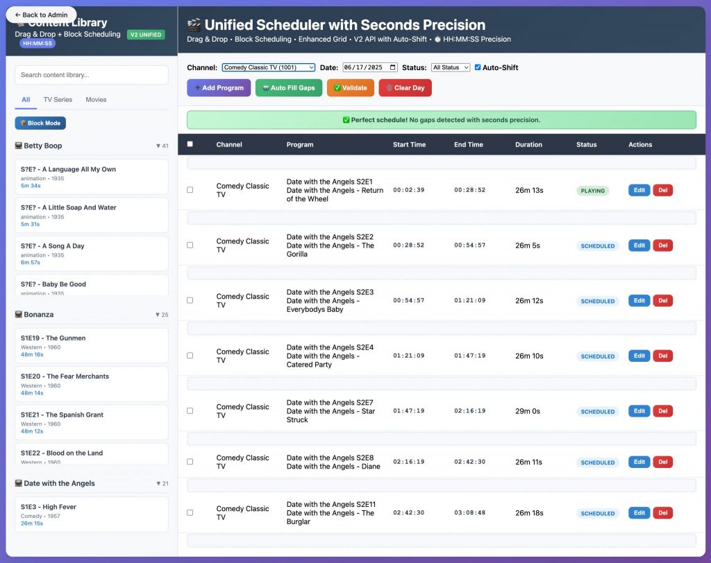 Perhaps our most impressive technical achievement is the Unified Scheduler with Second-Level Precision. Unlike traditional streaming platforms that work with approximate time blocks, WimZTV schedules content down to the exact second—delivering the same precision you’d expect from traditional broadcast television.
